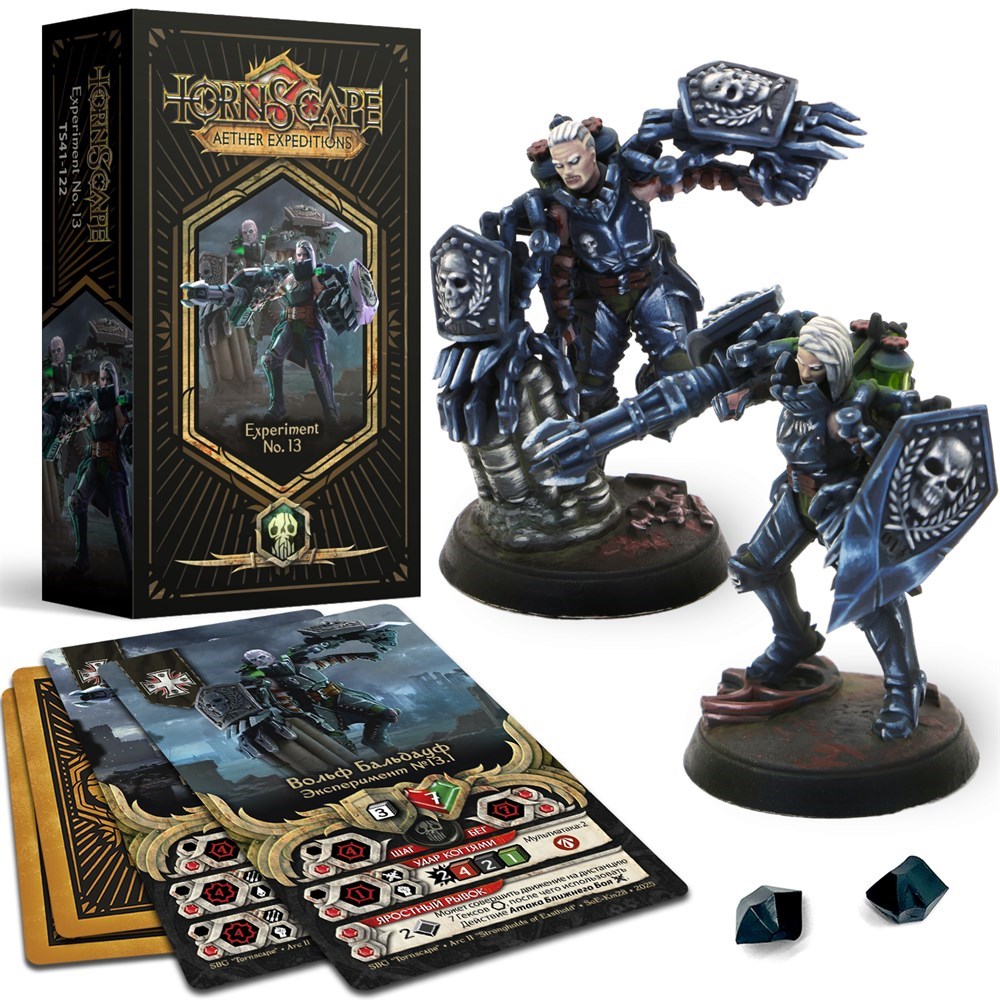 Миниатюры «Вольф Бальдауф, Эксперимент №13.1» и "Верена Бальдауф, Эксперимент №13.2" для настольной игры Tornscape. Данный набор состоит из деталей для сборки миниатюр, двух 32мм Подставок, двух Карточек Миниатюр и случайных Карты Бога (Смерть).