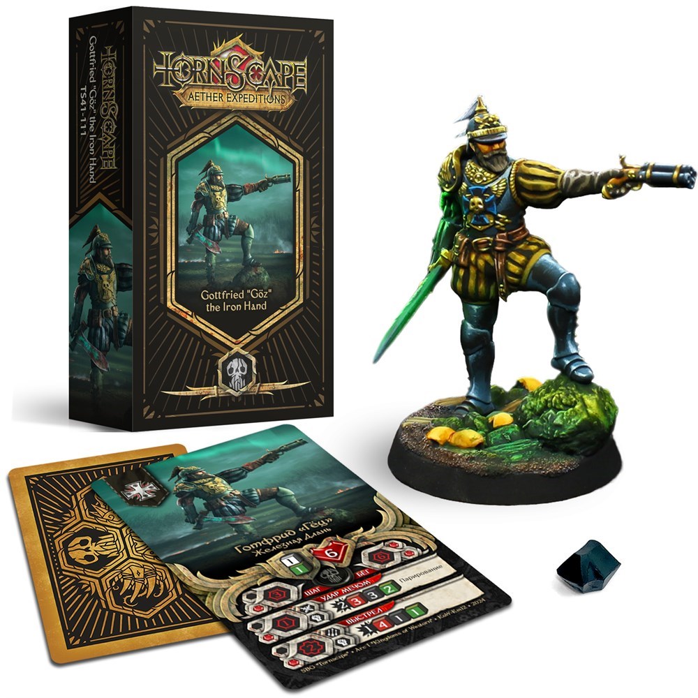 Миниатюра «Готфрид «Гёц» Железная Длань» для настольной игры Tornscape. Данный набор состоит из деталей для сборки миниатюры, 32мм Подставки, Карточки Миниатюры и случайной Карты Бога (Смерть).