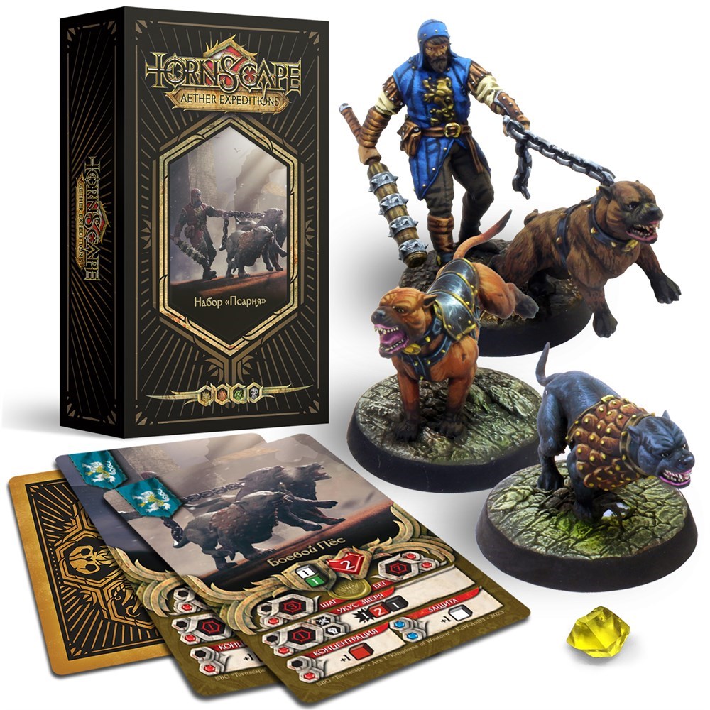 Миниатюры «Псарь Ангельна» и "Боевые Псы" для настольной игры Tornscape. Данный набор состоит из деталей для сборки миниатюр, 32мм Подставок, Карточек Миниатюр и случайной Карты Бога (Созидание).