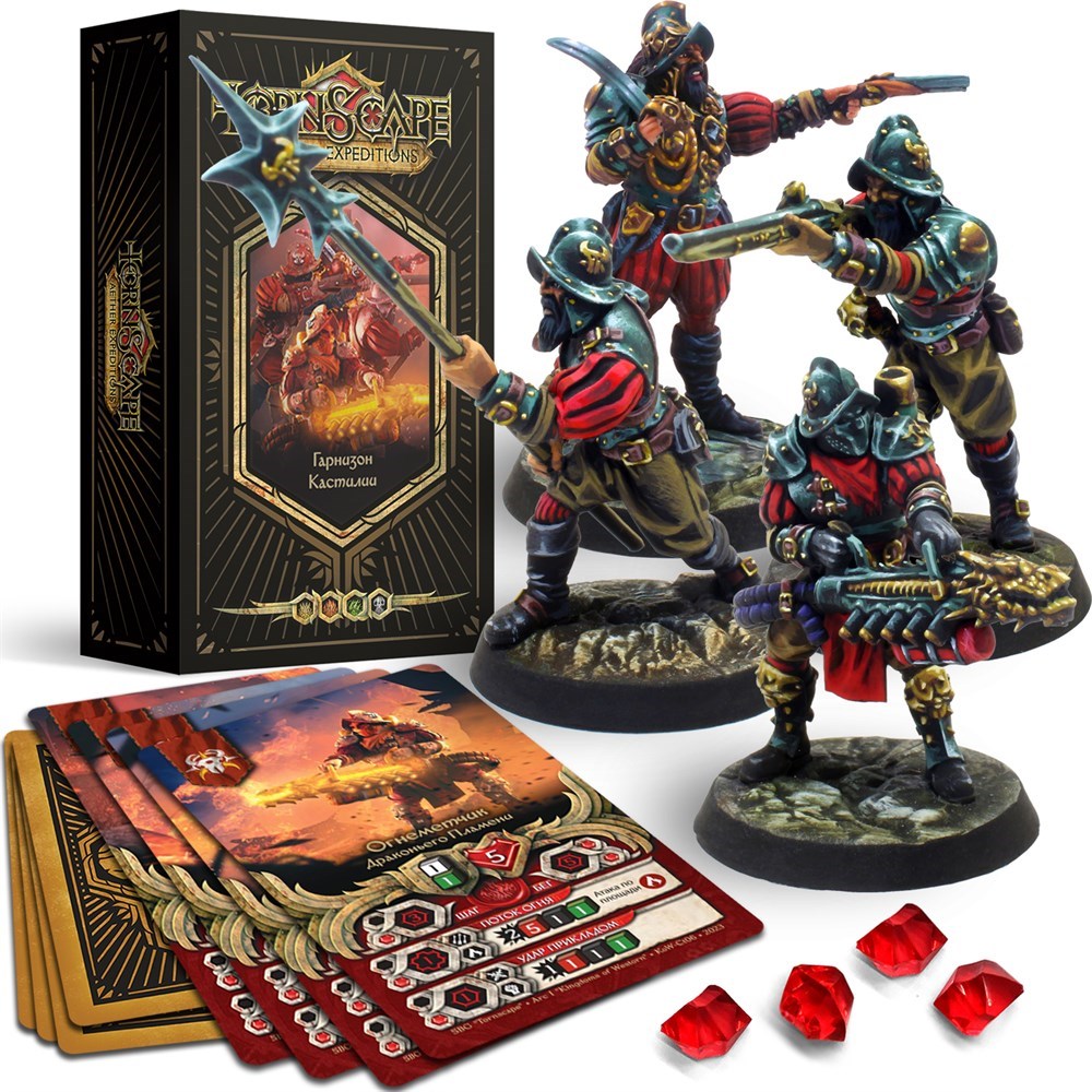 Миниатюры из набора «Гарнизон Кастилии» для настольной игры Tornscape. Данный набор состоит из деталей для сборки миниатюр, 32мм Подставок, Карточек Миниатюр и случайных Карт Богов (Разрушение).