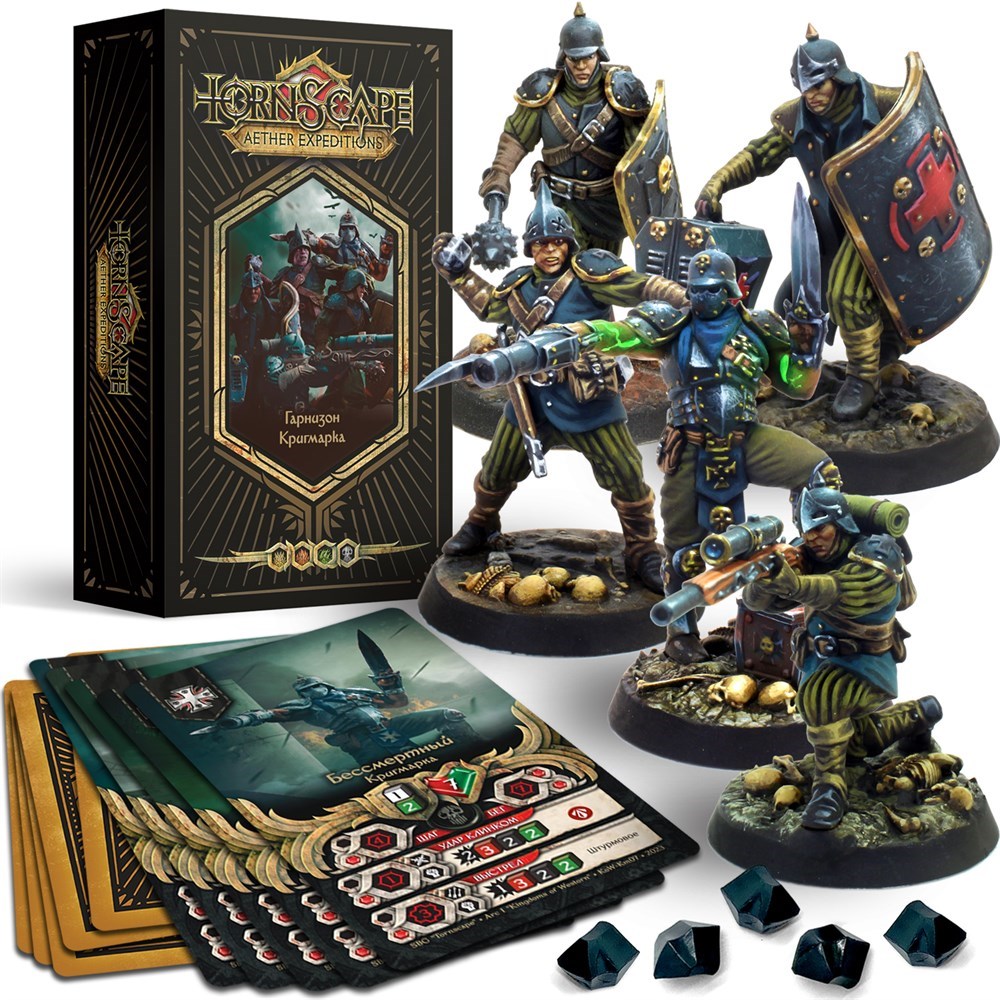 Миниатюры из набора «Гарнизон Кригмарка» для настольной игры Tornscape. Данный набор состоит из деталей для сборки миниатюр, 32мм Подставок, Карточек Миниатюр и случайных Карт Богов (Смерть).