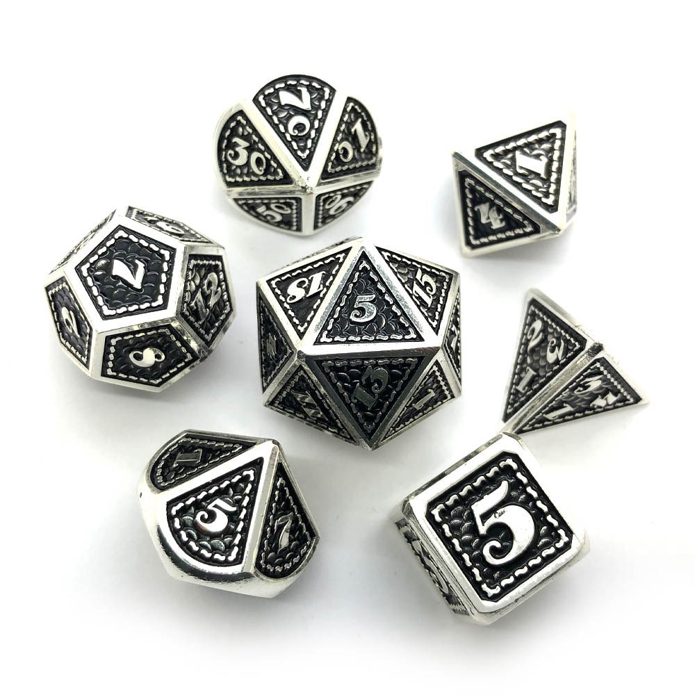 Кубики ДнД (7 шт) металлические / Дайсы для DnD / Dungeons & Dragons / RPG / Чешуя дракона (черный с серебром) 16мм
