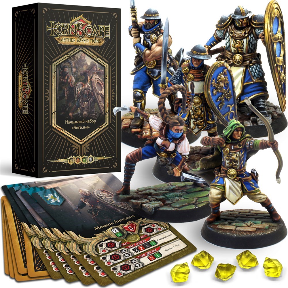 Миниатюры из начального набора «Ангельн» для настольной игры Tornscape. Данный набор состоит из деталей для сборки миниатюр, 32мм Подставок, Карточек Миниатюр и случайных Карт Богов (Созидание).