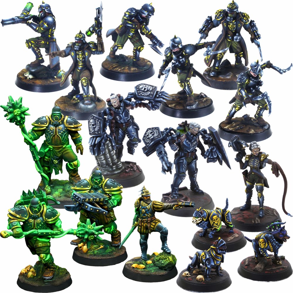 - 3 Миниатюры «Штосскригеров» (каждая имеет две опции вооружения: булава или стреломет; в наборе 3 видов голов, совместимых с каждым из трех торсов, в наборе также идут 3 обычных рюкзака и 3 пусковых стреломета, которые могут крепиться на спину);