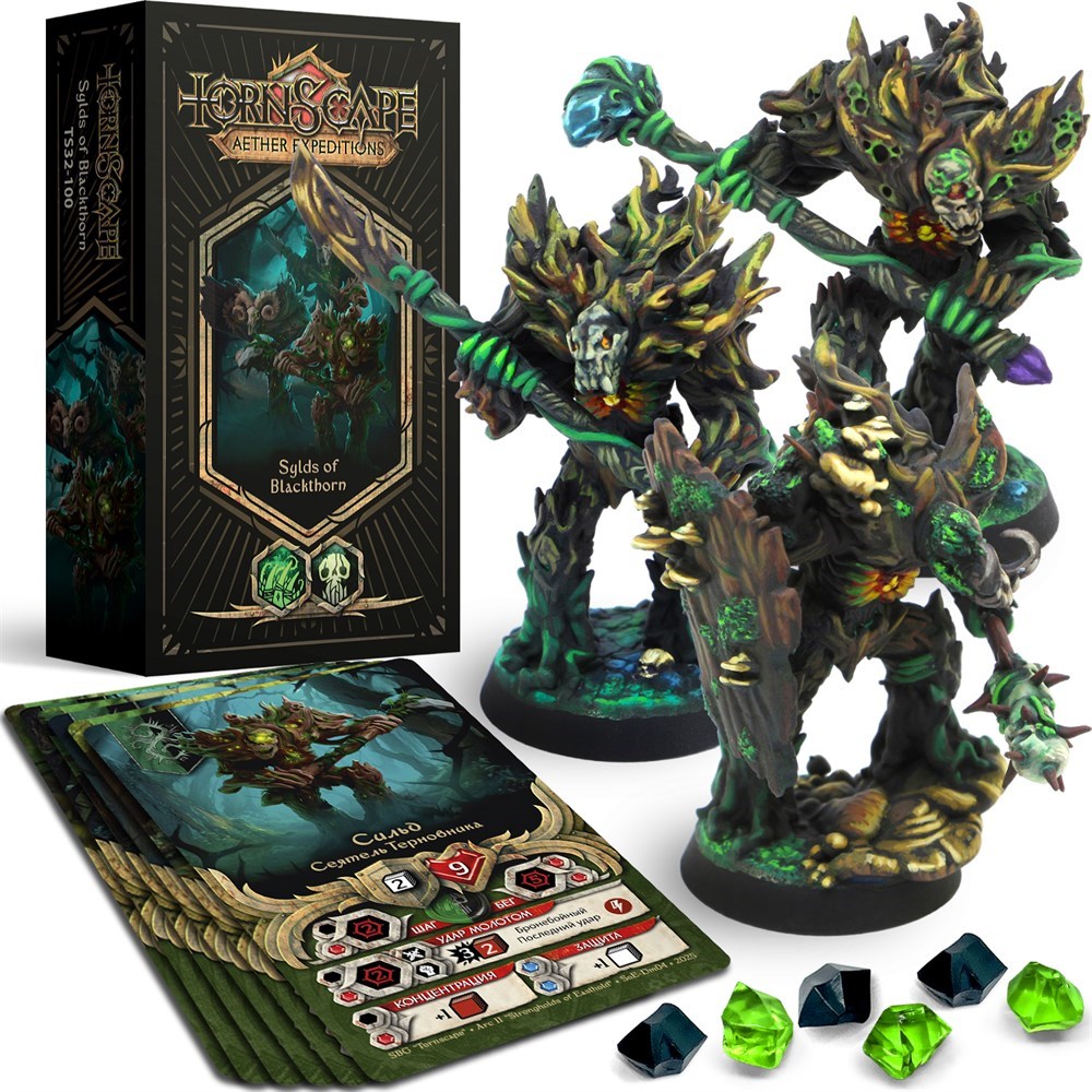 Сильды Терновника - это набор, включающий в себя три миниатюры фракции Великий Терновник. Внутри набора вы найдете 3 миниатюры и карточки к ним. Для полноценной игры Вам понадобятся: игровое поле, кубики и карты богов.